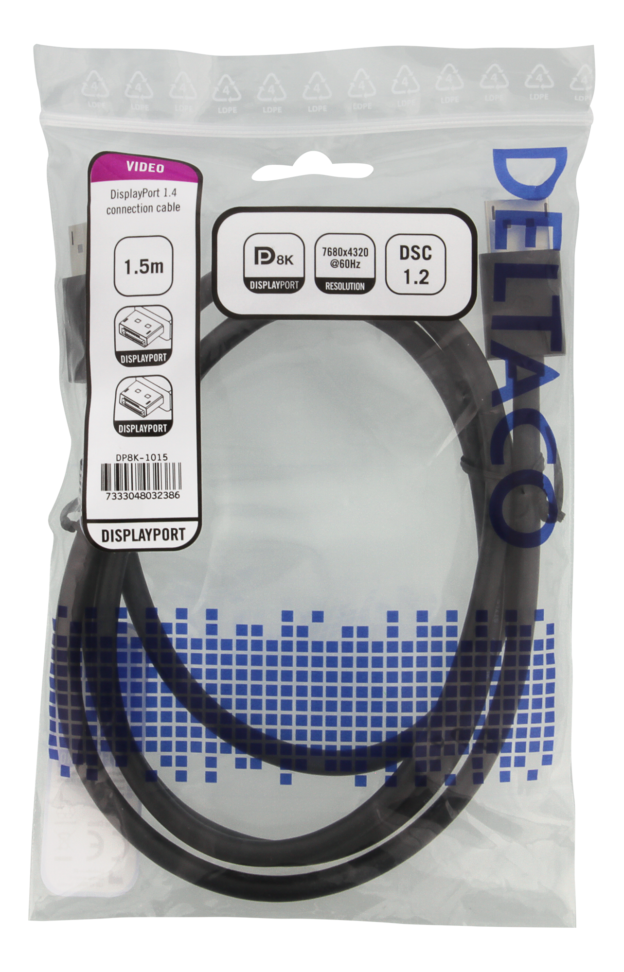 DisplayPort-kabel, DP 1.4, 8K@60Hz, Deltaco, 1,5 meter - Svart