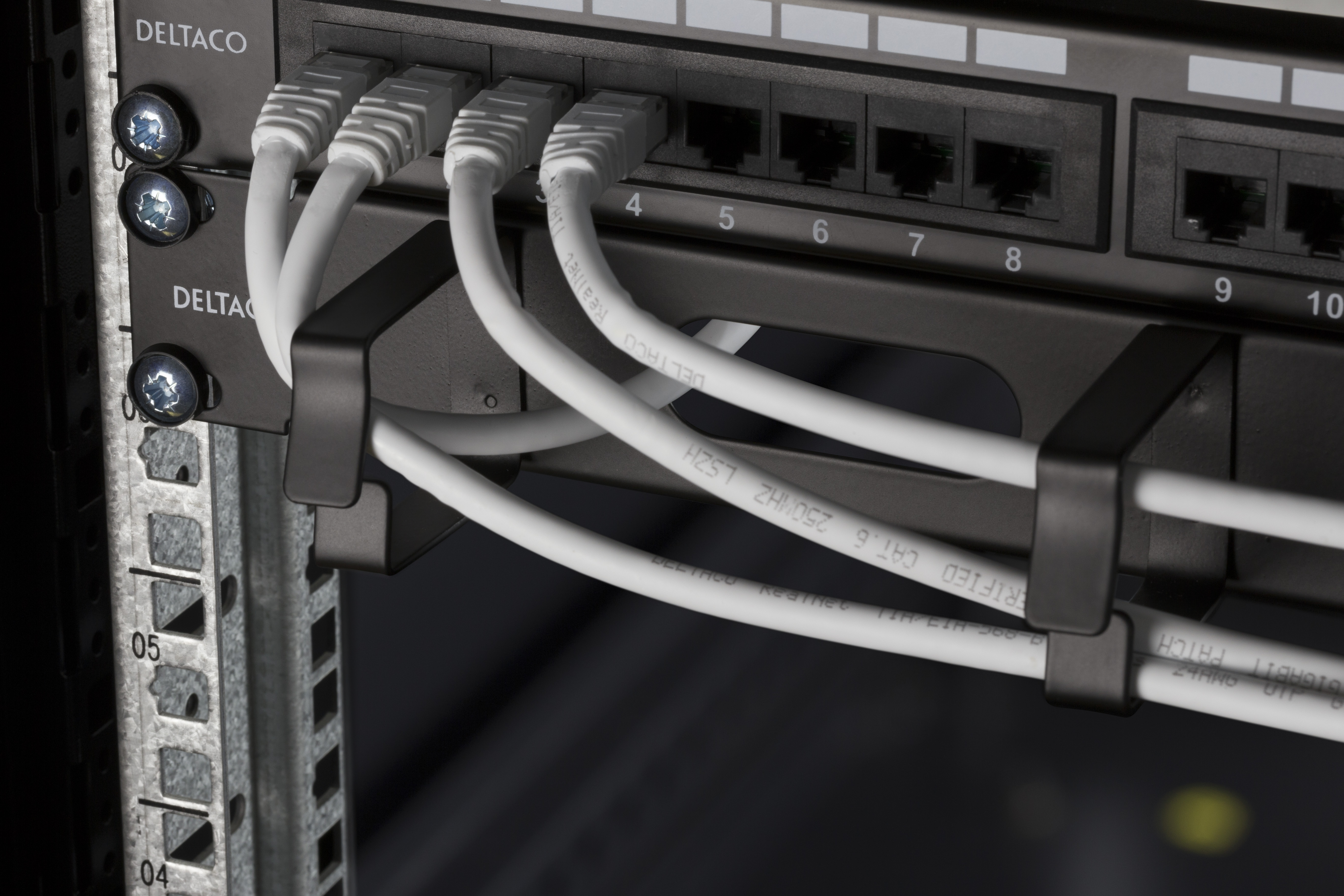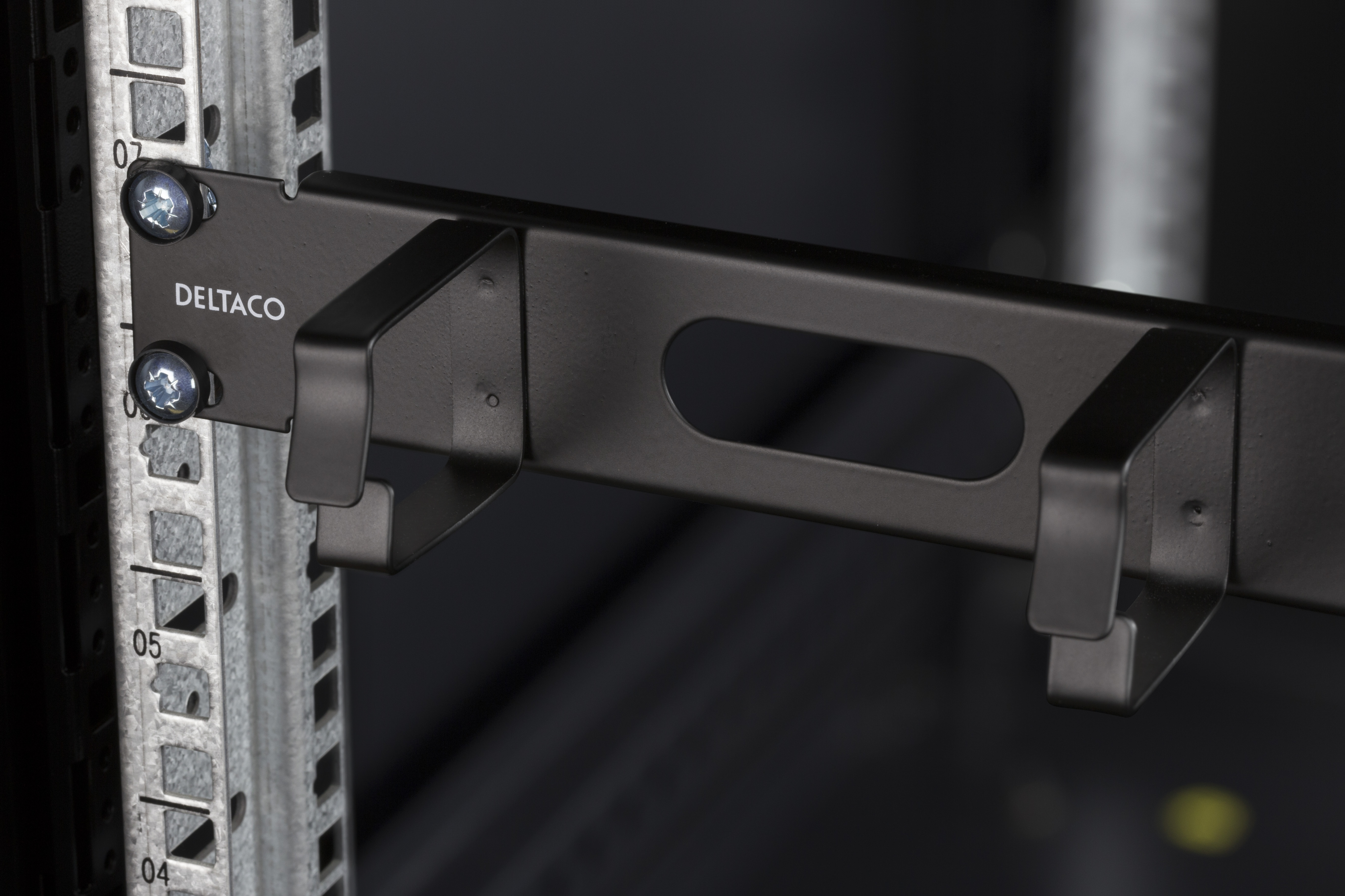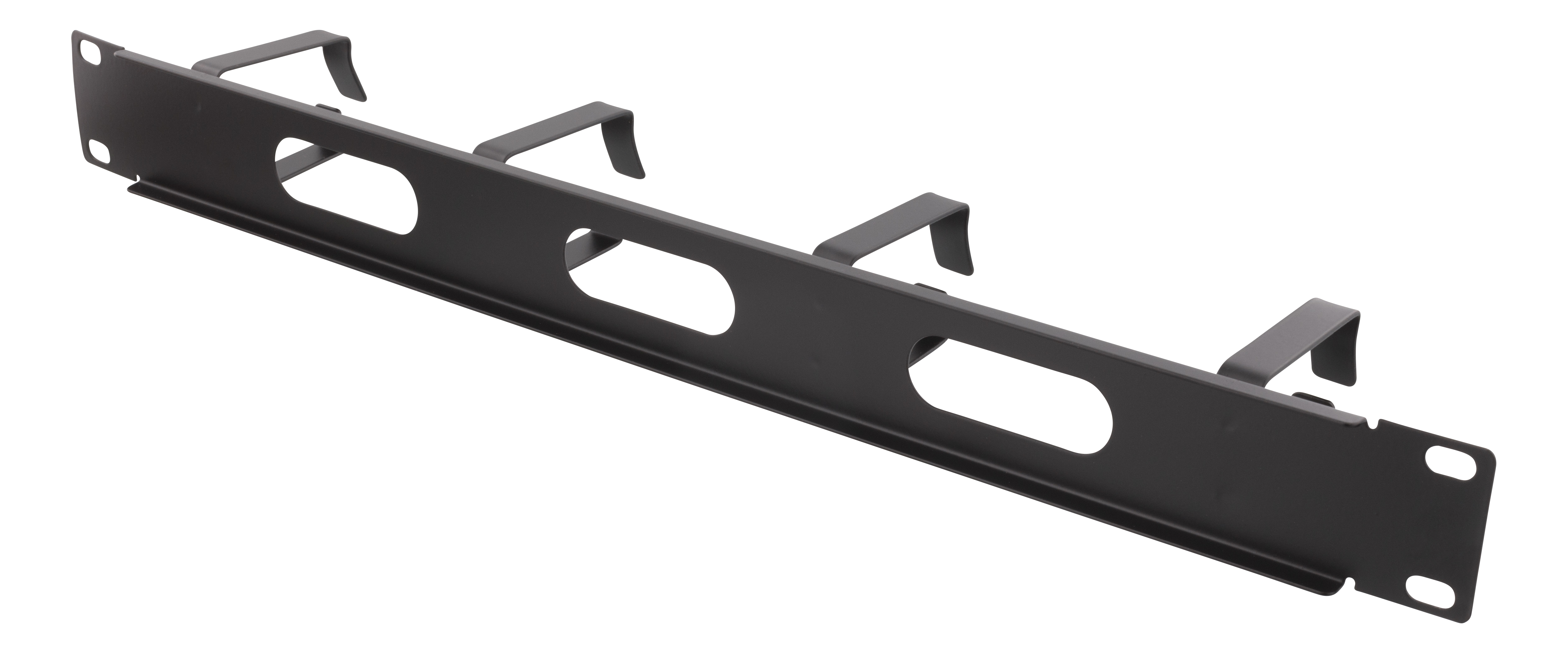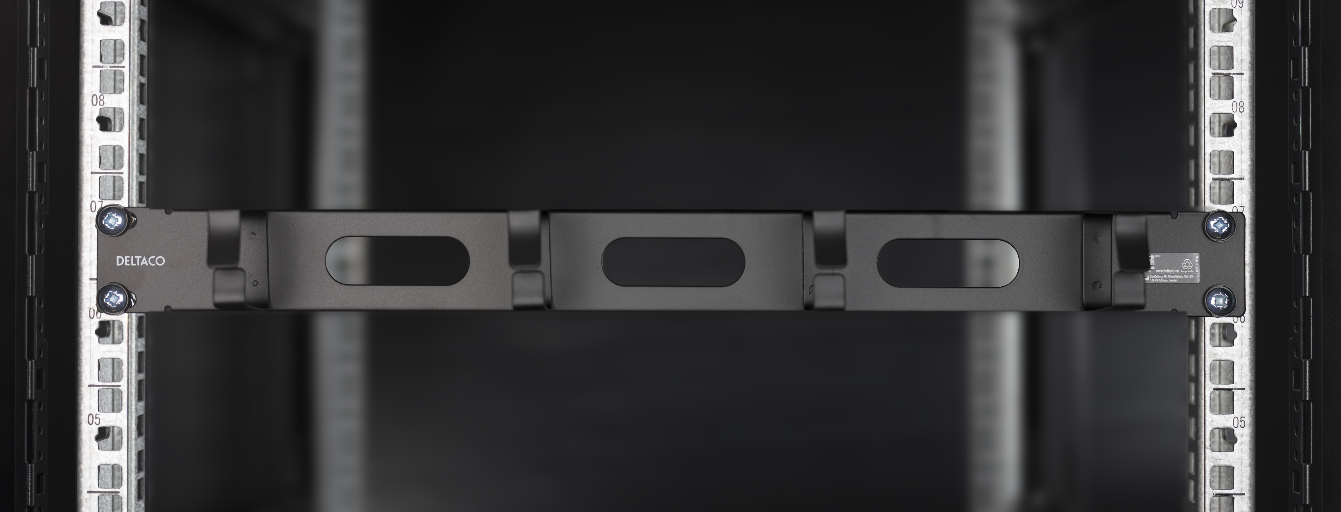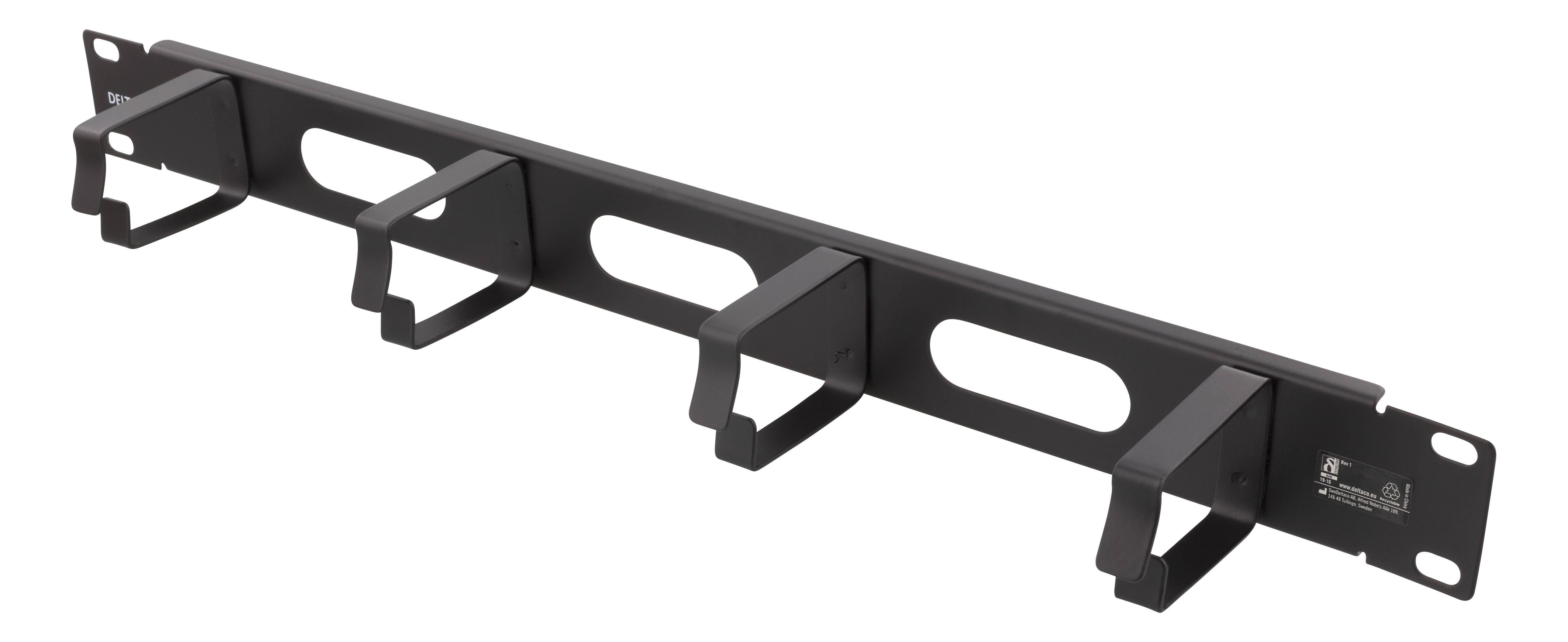 19” kabelhanterare, Deltaco, 1U, metall, 4 öglor och genomföring, - svart