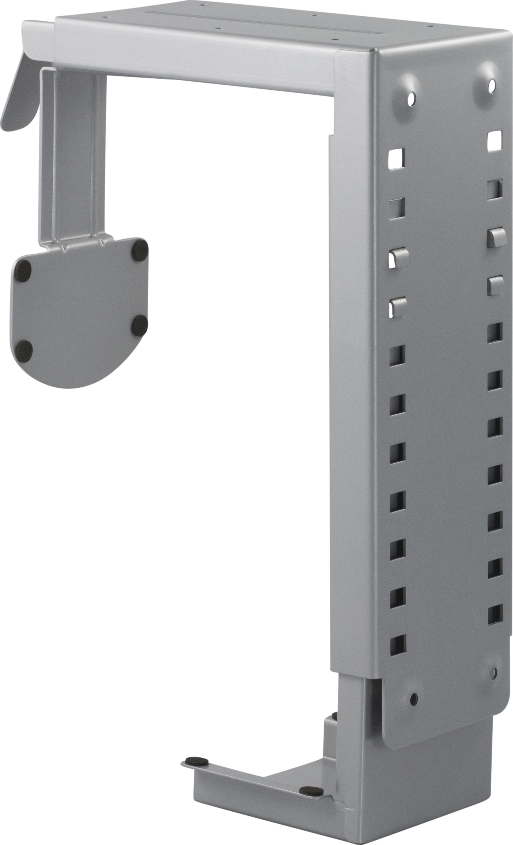 Med denna datorhållare kan du montera en stationär dator antingen under ett skrivbord eller på en vägg. På ytorna där datorn kommer att ligga emot finns mjuka skyddsplattor för att inte skada chassit. Tack vare låsskruvar kan datorn fixeras efter önskad höjd och bredd. Hela konstruktionen är tillverkat i stål.