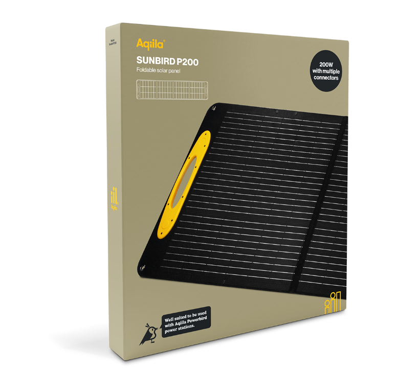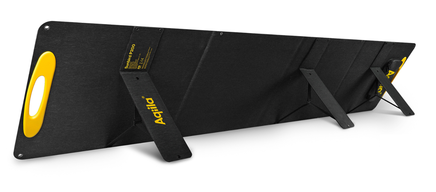 Sunbird P200 är en högeffektiv hopfällbar solpanel med justerbara fotstöd. Den fungerar utmärkt med Aqiila Powerbird powerstations och de flesta andra modeller av powerstations.