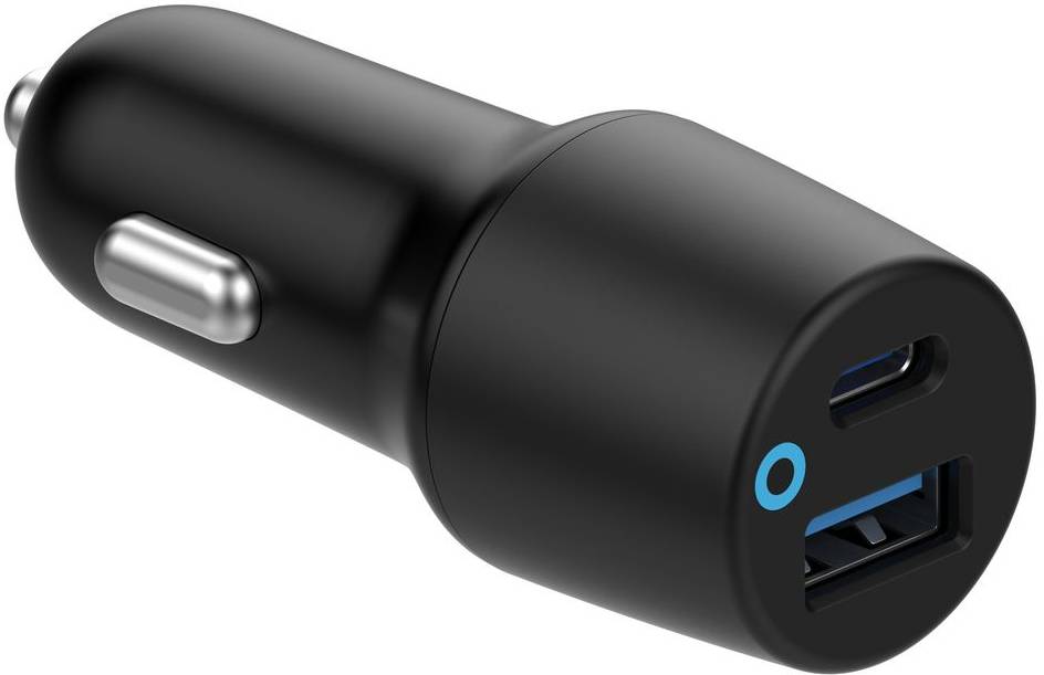 High quality car charger for smartphones and tablets with one USB-C PD output and one USB-A output. The charger is made from high quallity carbon fiber. It allows fast charging on both ports simultaniously. All eSTUFF car chargers are tested and approved for use within the EU.