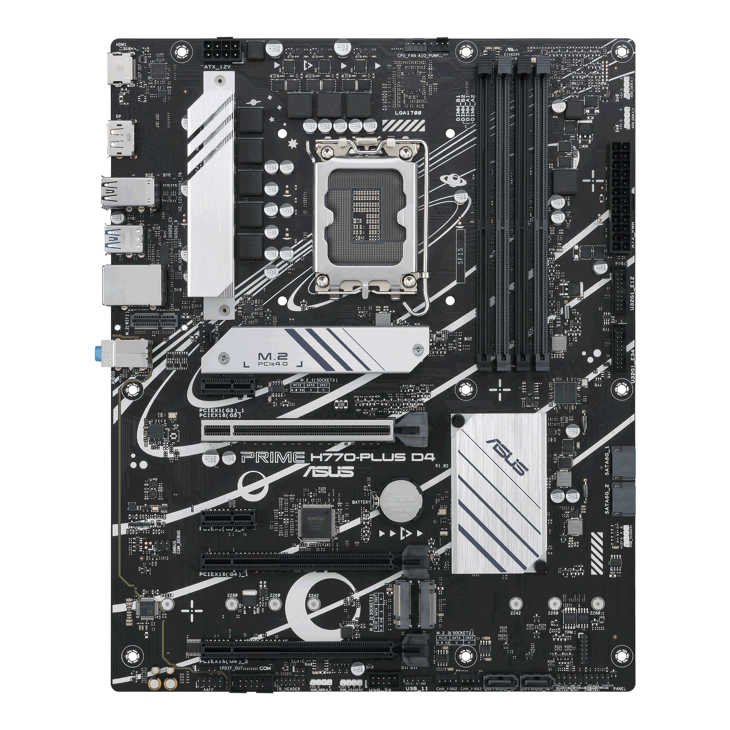 ASUS Prime H770-PLUS D4, an Intel® H770 LGA 1700 ATX motherboard with PCIe 5.0, three PCIe 4.0 M.2 slots, DDR4, Realtek 2.5Gb Ethernet, DisplayPort, HDMI®, SATA 6 Gbps, USB 3.2 Gen 2 Type-C®, Thunderbolt™ (USB4®) support, Aura Sync