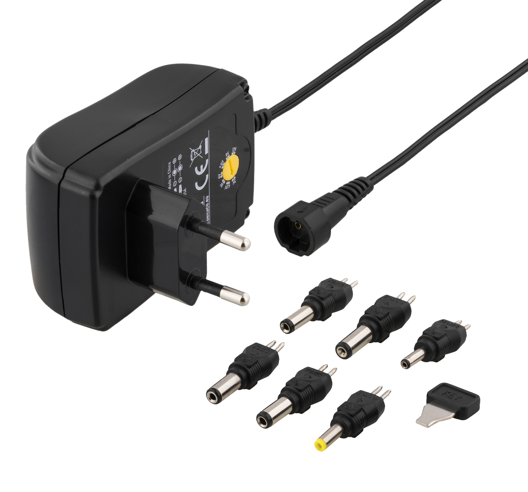 Switched AC to DC adapter with adjustable voltage of: 3 / 4.5 / 5 / 6 / 7.5 / 9 / 12 V. You can reverse the polarity of the connectors.