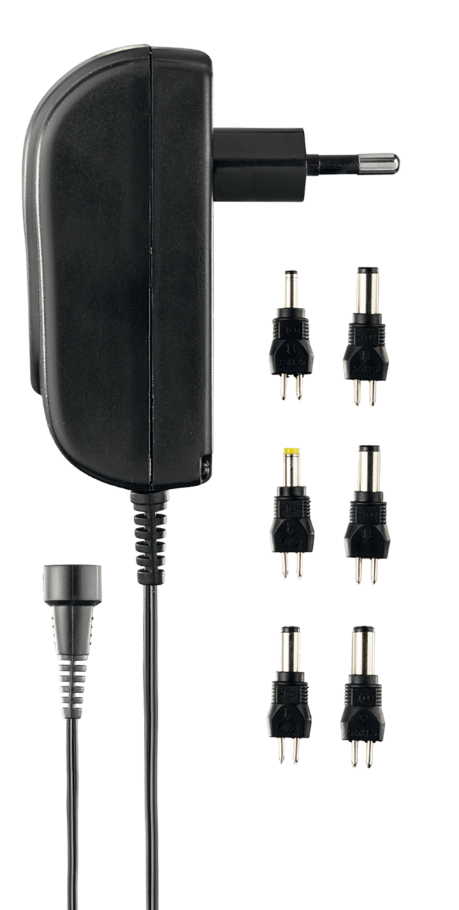 Switchad AC- till DC-adapter med ställbar volt på: 3 / 4,5 / 5 / 6 / 7,5 / 9 / 12 V. Polariteten på kontakterna kan vändas.