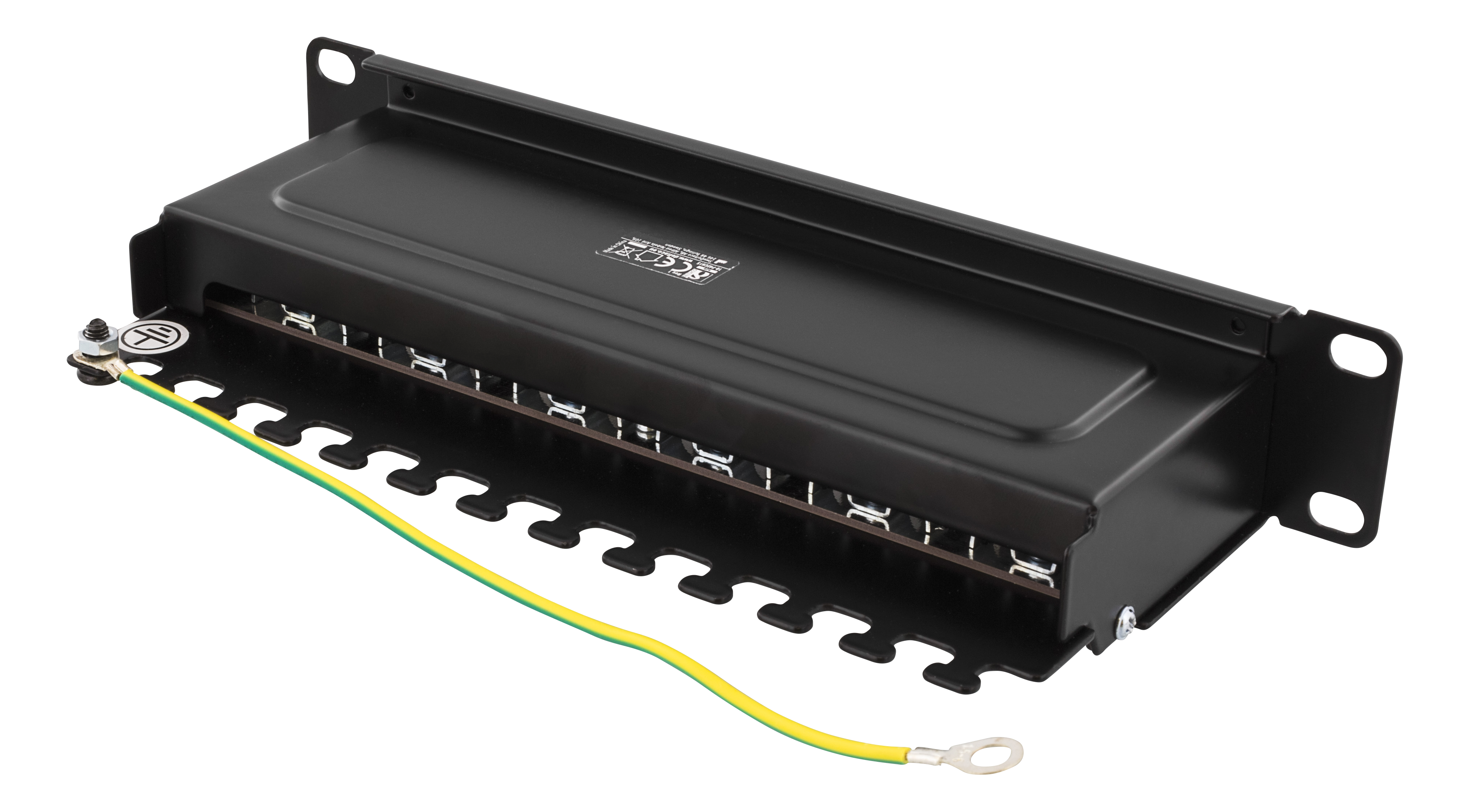 Skärmad patchpanel med 12st RJ45-portar anpassad för montering i 10" rack. På baksidan sitter ett täcklock som enkelt skruvas på och av för att skydda krone-plintar och kablage. Kablaget går också att skruva fast för en säker installation.