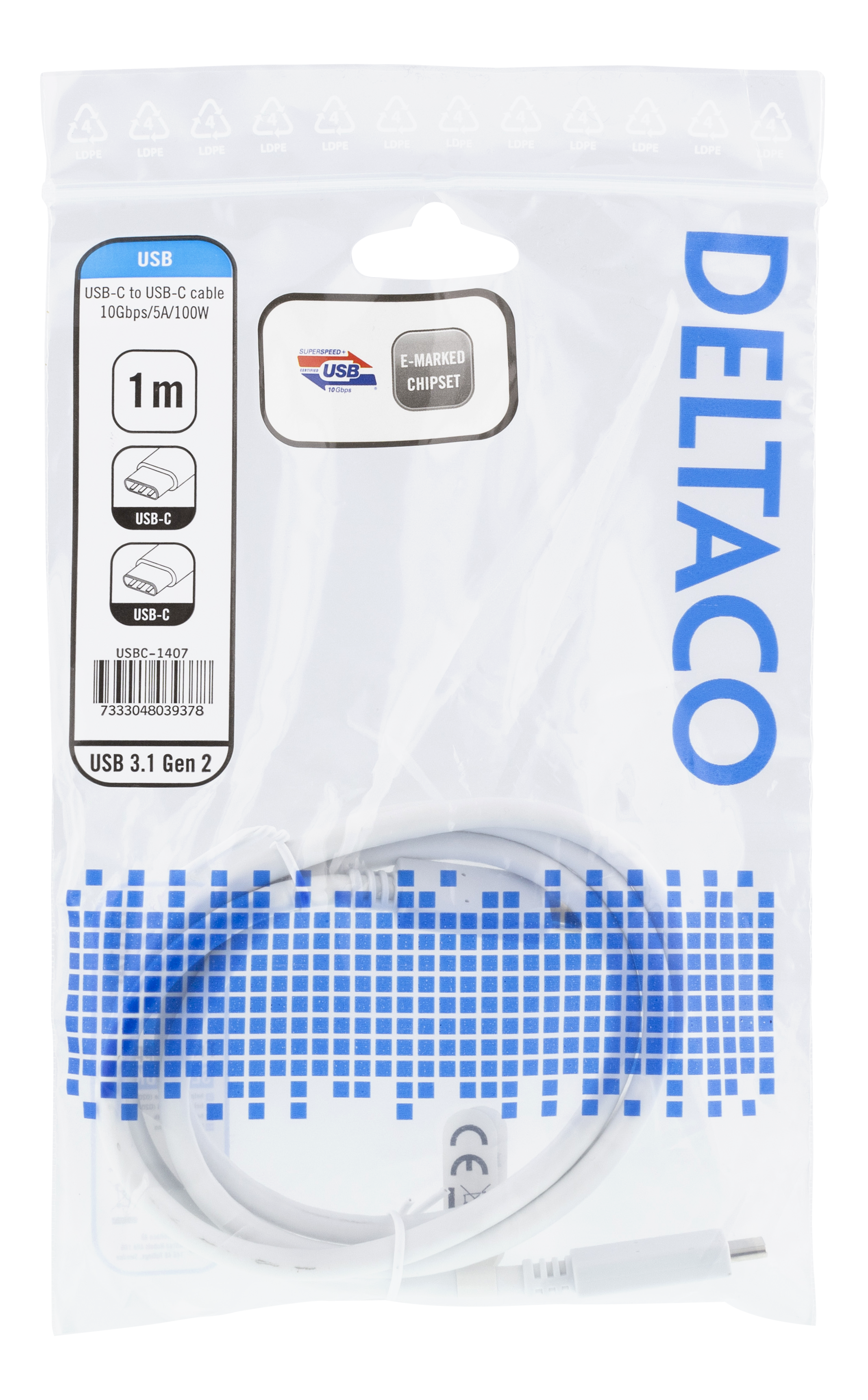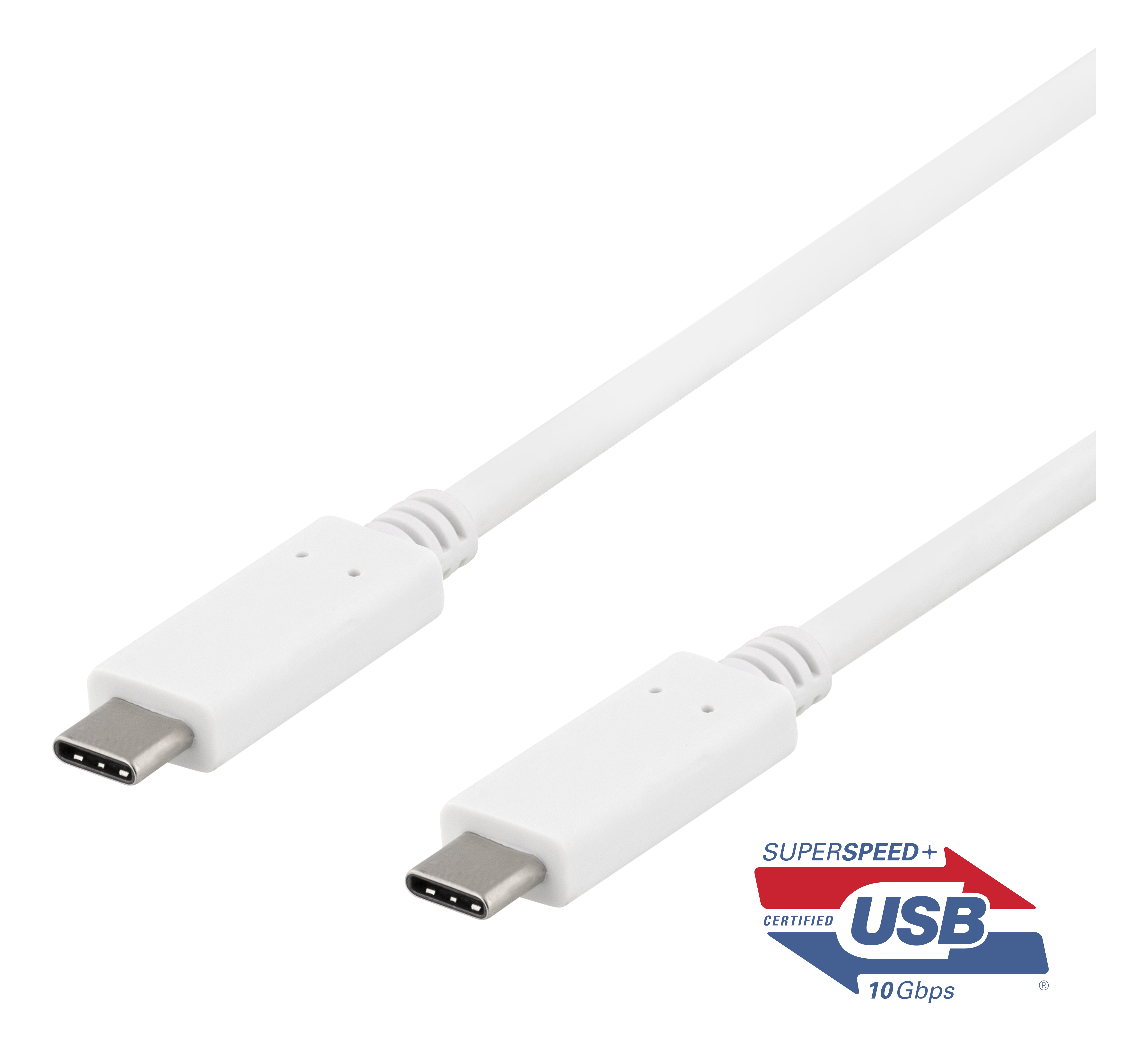 USB-C 3.1-kabel Gen2 Typ C ha till C ha, 1 meter, 100W PD, Deltaco - Vit