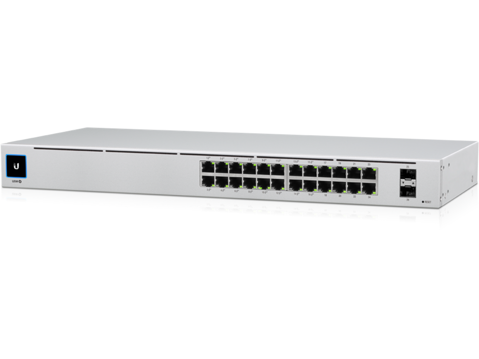 The Switch 24 PoE (USW 24 PoE) is a fully managed switch with (24) GbE RJ45 ports, including (16) GbE, 802.3at PoE+ ports, and (2) 1G SFP ports. The versatile USW 24 PoE provides Gigabit PoE links to Ethernet devices while also supplying Gigabit fiber uplink options fit for an enterprise network. The switch also offers an extensive suite of Layer 2 switching protocols, including port-specific operation modes (switching, mirroring, or aggregate), and features a 1.3" LCM color touchscreen that concisely displays key system and connection insights.
