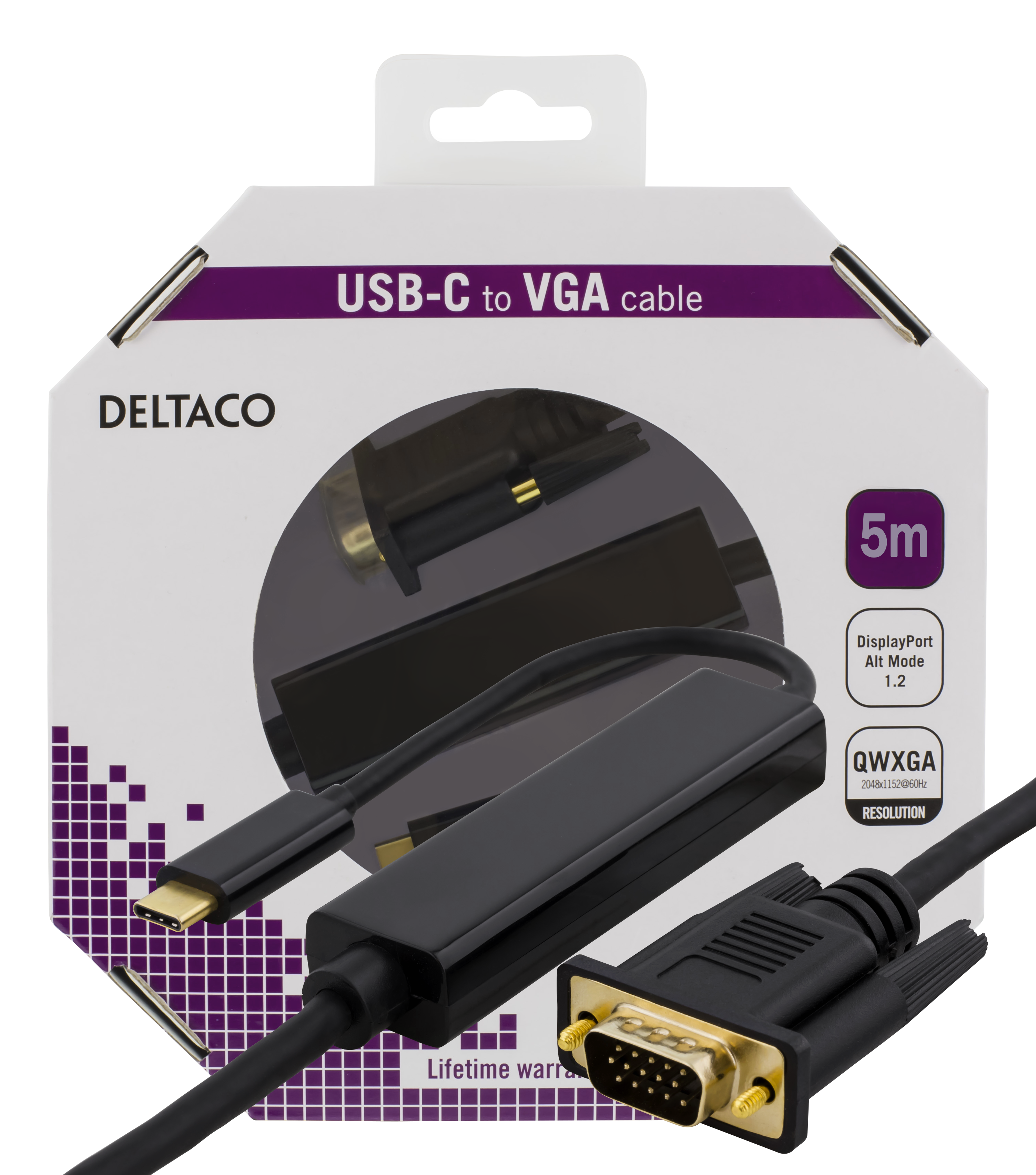 DELTACO USB-C - VGA kabel, 5m, USB-C, VGA, QWXGA 2048x1152 i 60Hz, DP 1.2 Alt Mode, svart