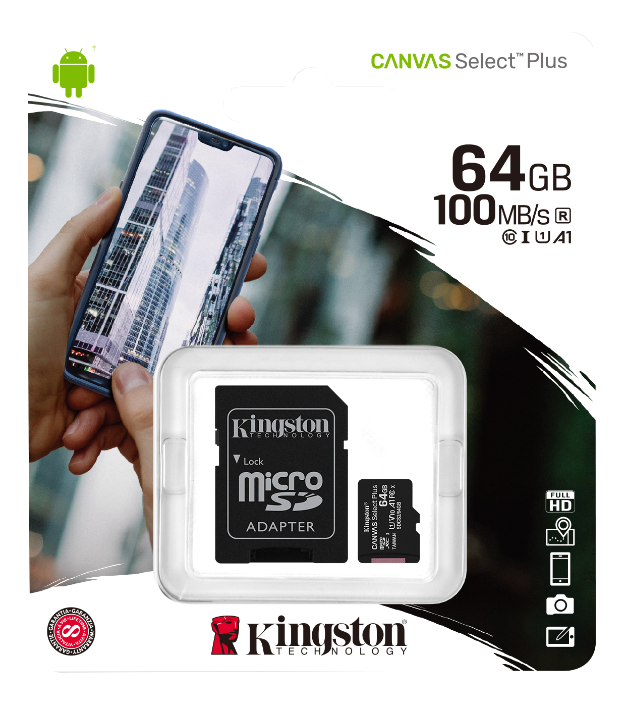Micro Secure Digital SDXC 64 GB Kingston Canvas Select Plus, 100/85 MB/sek, Class 10, A1, UHS-I U1, inkl. SD-adapter