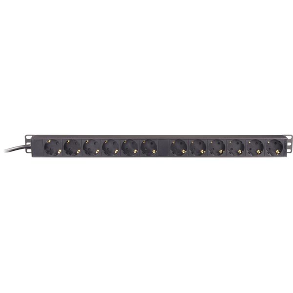 Grenuttag DELTACO, 12x Schuko uttag, petskyddad, 3m kabel, rackmontage vertikalt, 1U - Svart