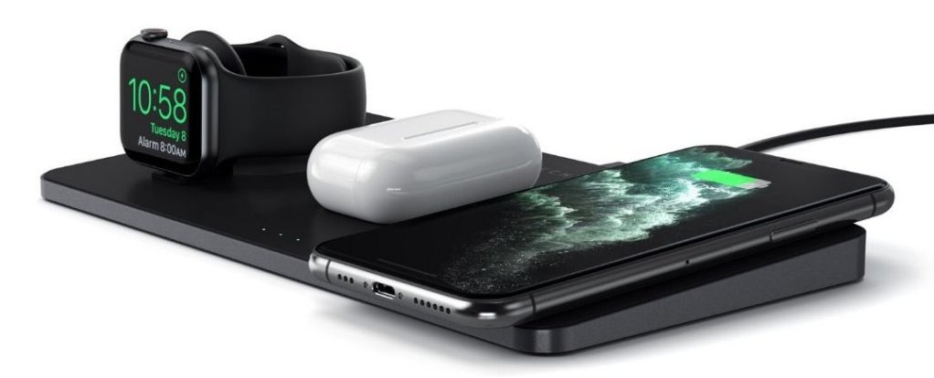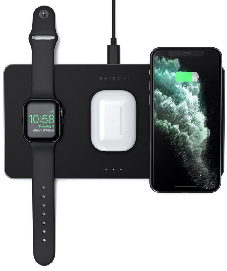 Satechi Trio trådlösa laddningsplatta förenklar trådlös laddning med en bekväm plats för alla dina enheter ? så att ditt batteri aldrig är utan laddning. Med snabbare laddningsteknik och intelligenta säkerhetsfunktioner, ger laddningsplattan snabb laddning till en Qi-utrustad smartphone, Apple Watch, och AirPods Pro samtidigt.