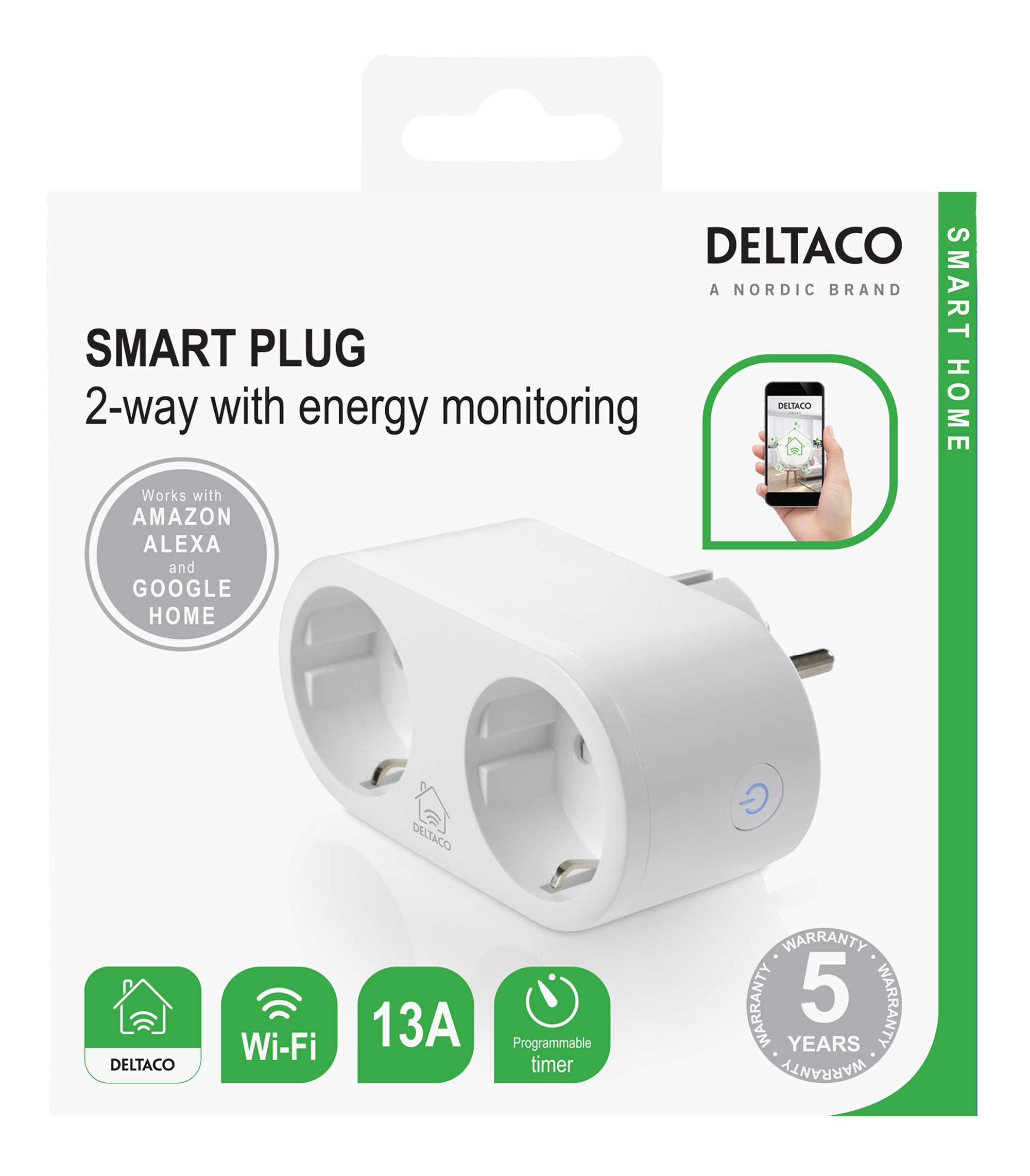 DELTACO SMART HOME strömbrytare, WiFi 2,4GHz, energiövervakning, 2xCEE 7/3, 13A, timer, vit