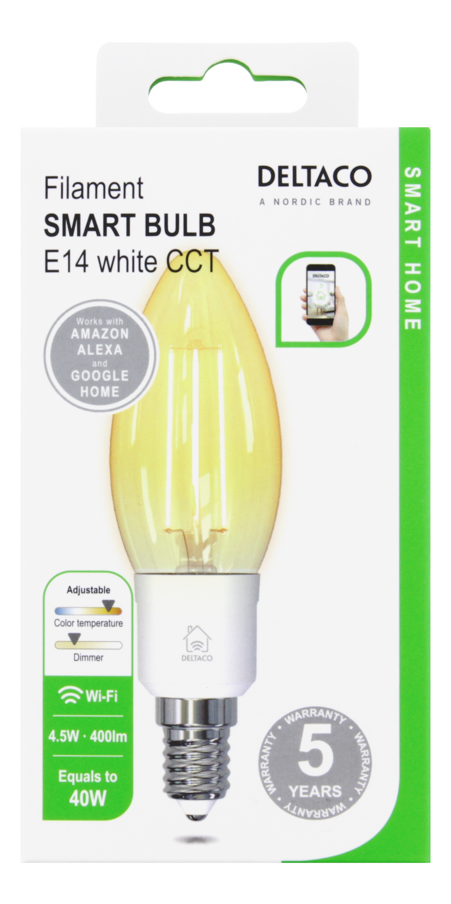 DELTACO SMART HOME LED-filamentlampa, E14, WiFI 2,4GHz, 4.5W, 400lm, dimbar, 1800K-6500K, 220-240V, vit