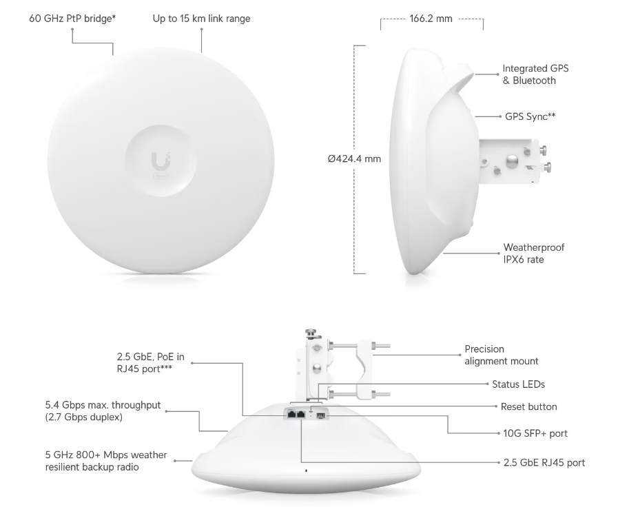 High-capacity 60 GHz radio that supports long-distance PtP (bridge) and PtMP links.Compatibility and supported distances:— PtP: Up to 15 km— PtMP: Up to 8 km (Wave AP), up to 6 km (Wave AP Micro)60 GHz primary radio with 5.4 Gbps (2.7 Gbps duplex) maximum throughput5 GHz 800+ Mbps weather-resistant backup radio(2) 2.5 GbE and (1) 10G SFP+ portsErgonomic transportation handlePrecision alignment mountIntegrated GPS & BluetoothTechnical SpecificationsMechanical Dimensions Ø424.4 x 166.2 mm (Ø16.7 x 6.5") Weight Without mount: 2.8 kg (6.2 lb) With mount: 4 kg (8.8 lb) Enclosure materials Aluminum alloy, UV stabilized plastic Mount material Stainless steel Pole mount diameter 25 to 76.2 mm (1 to 3") on pipe outer diameter Wind loading 369 N at 200 km/h (83 lbf at 125 mph) Weatherproofing IPX6 Hardware Processor Quad-core ARM® Cortex®-A53 at 1.4 GHz Memory DDR3L 512 MB Networking interface (2) 2.