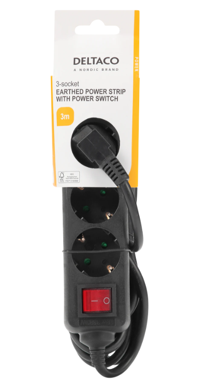 Grenuttag DELTACO med 3 st jordade uttag, brytare, 5m - Svart