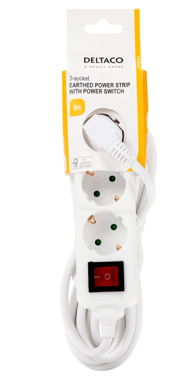 Grenuttag DELTACO med 3 st jordade uttag, brytare, 3m - Vit