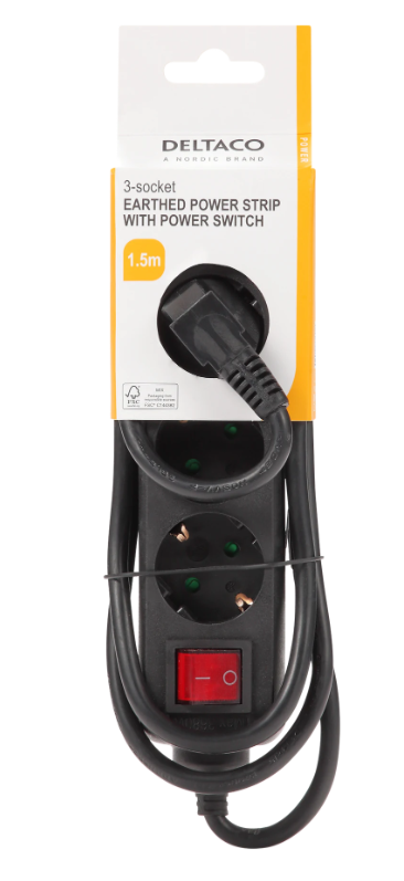 Grenuttag DELTACO med 3 st jordade uttag, brytare, 1,5m - Svart