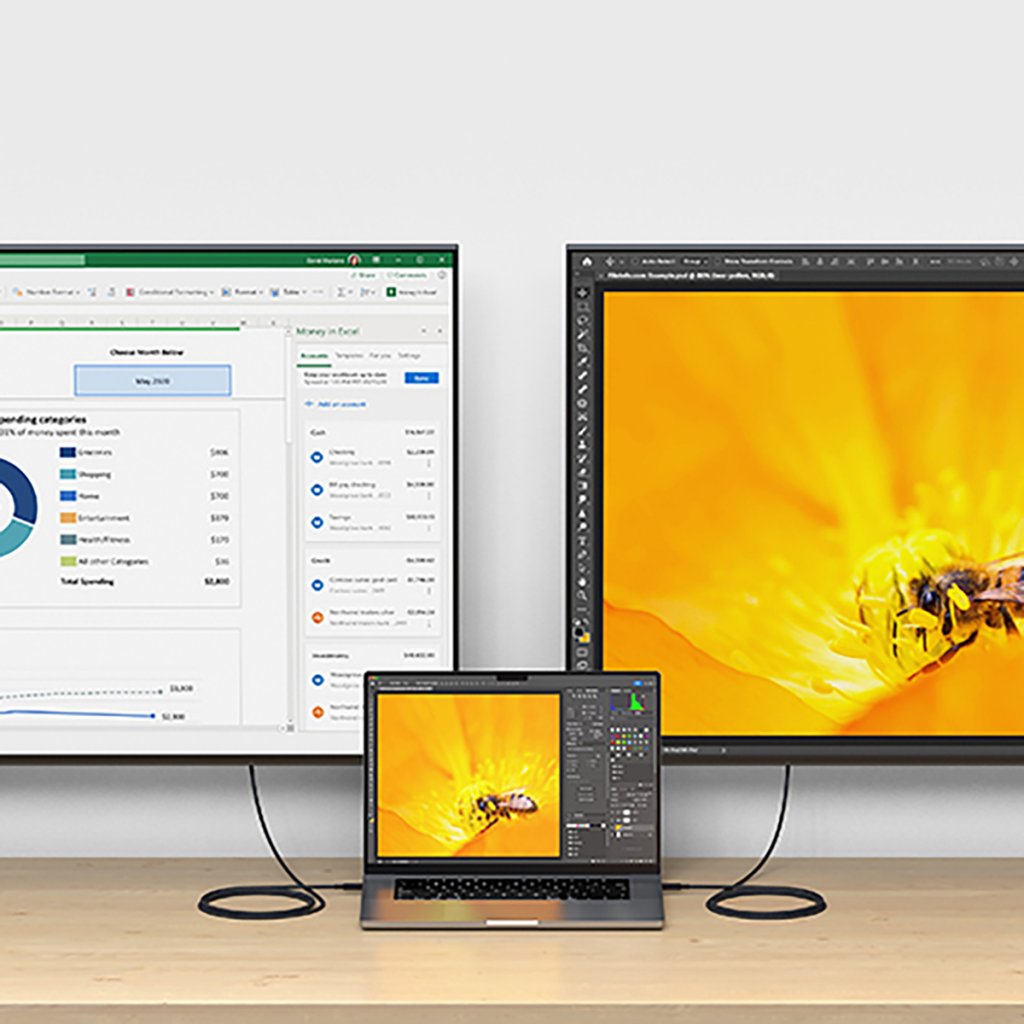 Förbättra din visuella upplevelse med Thunderbolt 4 Pro-kabelns förmåga att leverera 8K/60Hz-upplösning när den är ansluten till en Thunderbolt-aktiverad extern bildskärm. Upplev spänningen med hög upplösning oavsett om du arbetar, spelar eller tittar på ditt favoritprogram. Inbyggt PCIe-stöd