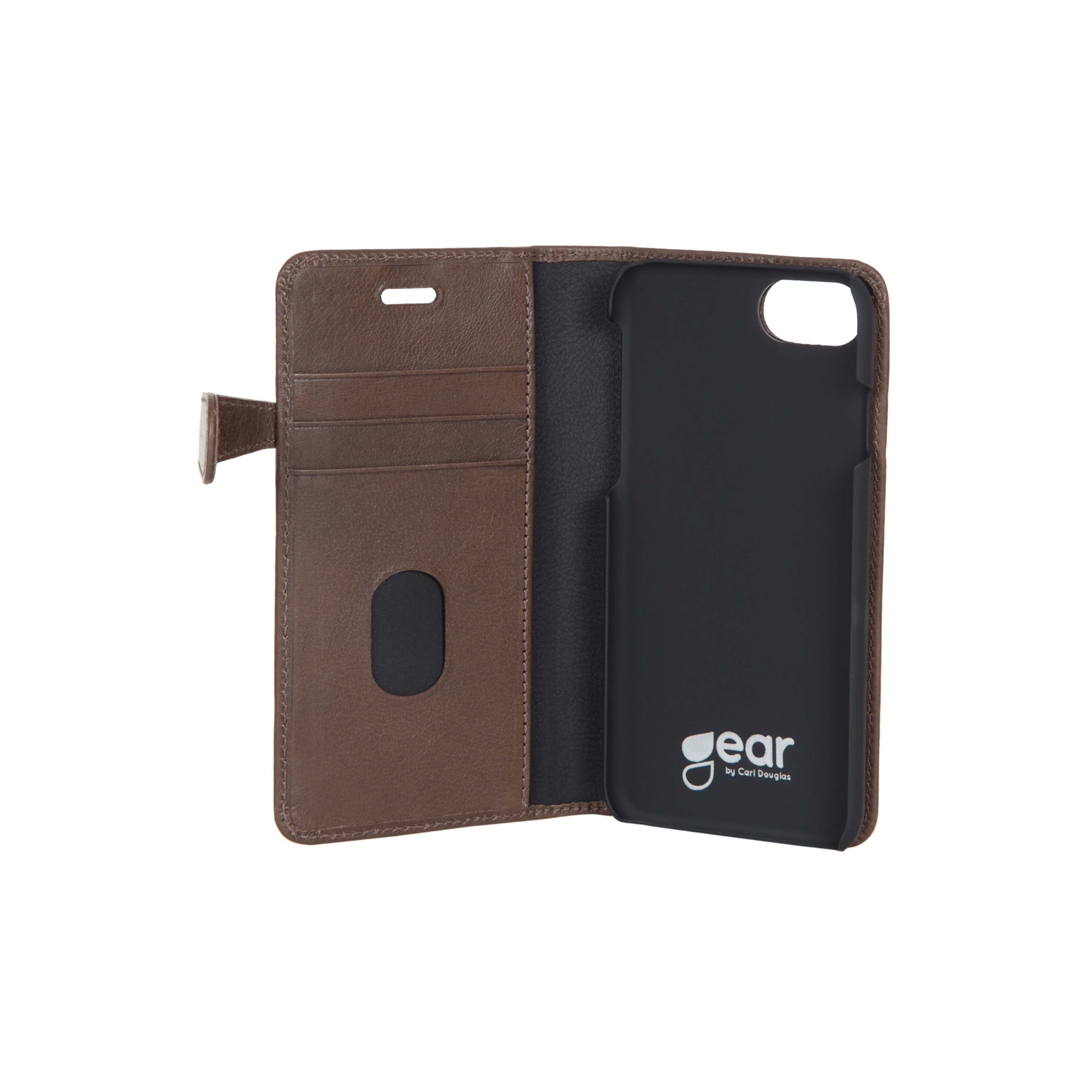 Gear BUFFALO plånboksväska av Aniline First Layer buffalo kvalitetsläder. Lädret är handgjort i Indien och produkten är designad i Sverige. Den har tre kortplatser och en sedelficka. Ett magnetspänne håller plånboken stängd. Det finns hål för högtalaren för konversation med stängd väska. Det finns ett hål för fingret för att enklare ta ut ett kredikort. Din smartphone skyddas i ett magnetskal som även kan tas ur plånboken. På baksidan av skalet återfinns samma exklusiva buffaloläder.