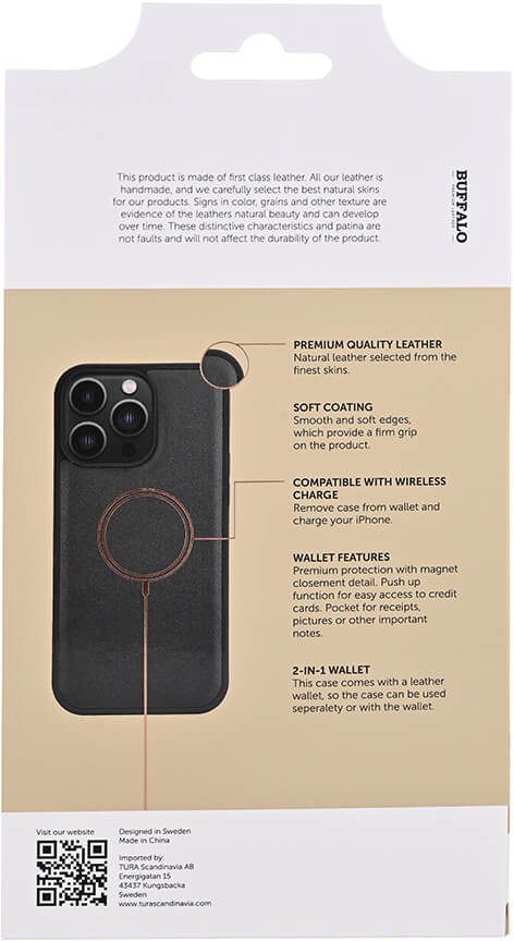 Buffalo mobilfodral är tillverkat av läder i Aniline First Layer-kvalitet. Det har tre kortplatser och en sedelficka. Ett magnetspänne håller plånboken stängd. Det finns hål för högtalaren för konversation med stängd väska. Det finns ett hål för fingret för att enklare ta ut ett kredikort. Din smartphone skyddas i ett magnetskal som även kan tas ur mobilfodralet. På baksidan av skalet återfinns samma exklusiva läder.