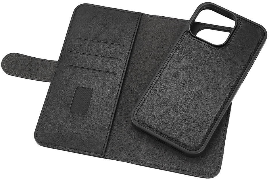 Mobilfodral 2-i-1 i konstläder som skyddar din telefon, har 3 fack för bankkort och ett fack för sedlar. Med urtagbart skal som stöder MagSafe och trådlös laddning.