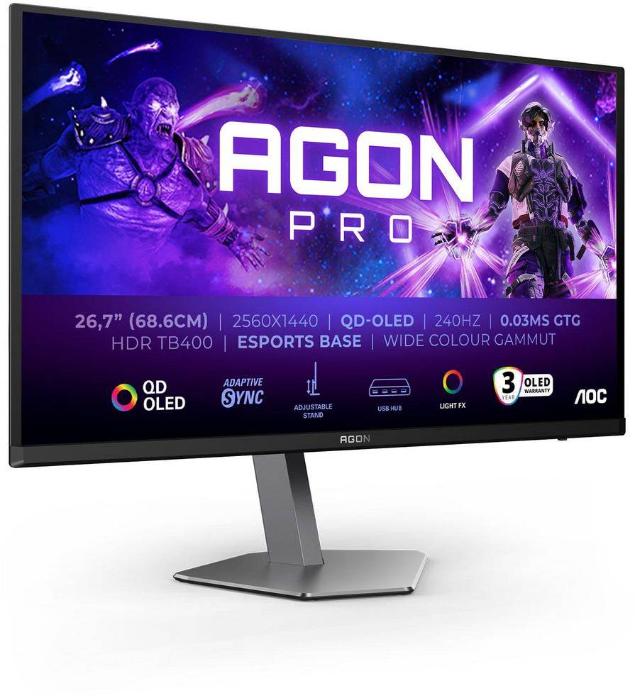 27" AOC Agon Pro AG276QZD2, QD-OLED 2560x1440, 0.03 ms, 240Hz, HDR400, höjdjusterbar, pivot, 2xHDMI/DP, högtalare, USB 3.2-hubb