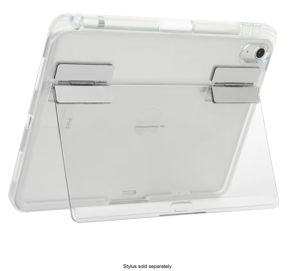 Let your iPad stand out with the Targus® Click-In™ Clear Case + Kickstand for iPad® (10th gen.) 10.9-inch. Complement your colorful new iPad with this clear case that’s engineered for durability without the extra weight. Featuring a shock-absorbent tray with wrap-around bezel and reinforced corners, it delivers military-grade drop protection (up to 4 feet/1.2 meters)* in a slim design. Its built-in kickstand flips out to offer hands-free viewing in multiple angles while in landscape mode, making it easy to watch the screen at nearly any angle. Plus, enjoy added efficiency with an integrated holder for your Apple Pencil® or stylus (Pencil sold separately by Apple®).