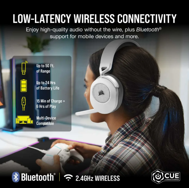 Corsair HS65 Wireless White V2, RF/Bluetooth, 7.1 surround - Vit