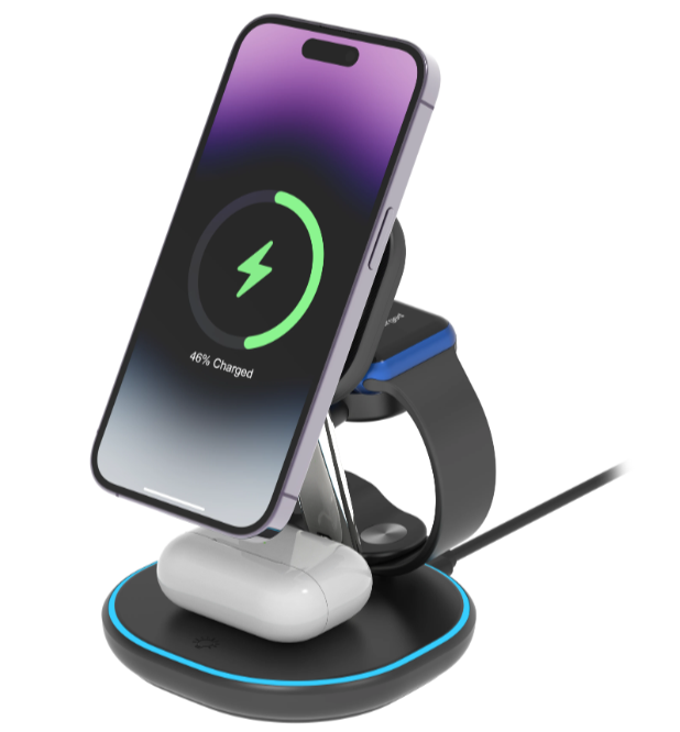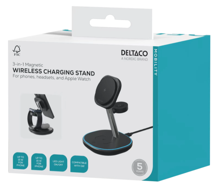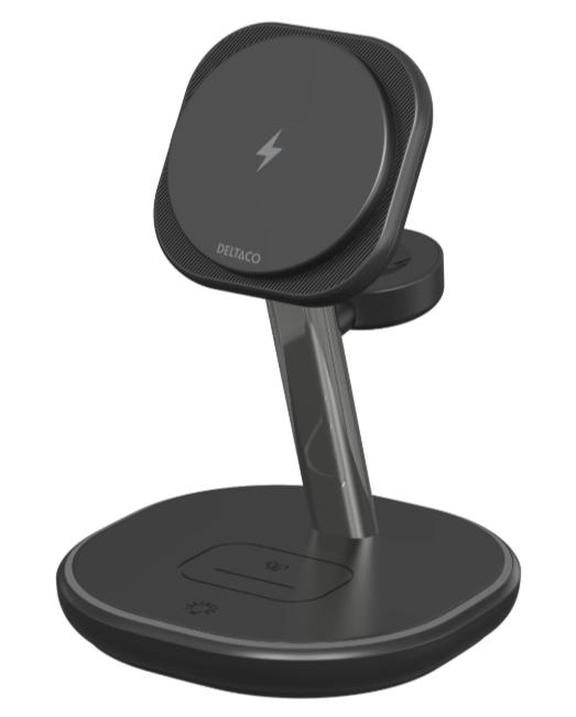 Deltaco 3-i-1 magnetiskt trådlöst laddningsställ, iPhone/TWS/Klocka, LED-ljus, inkl. USB-C laddningskabel