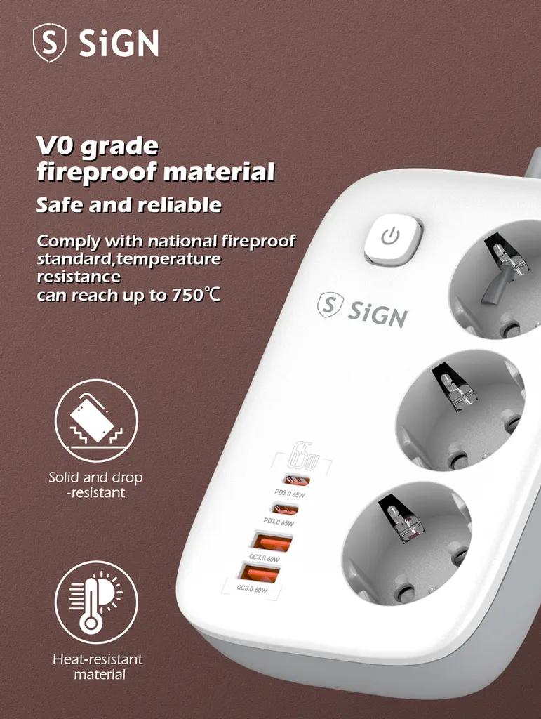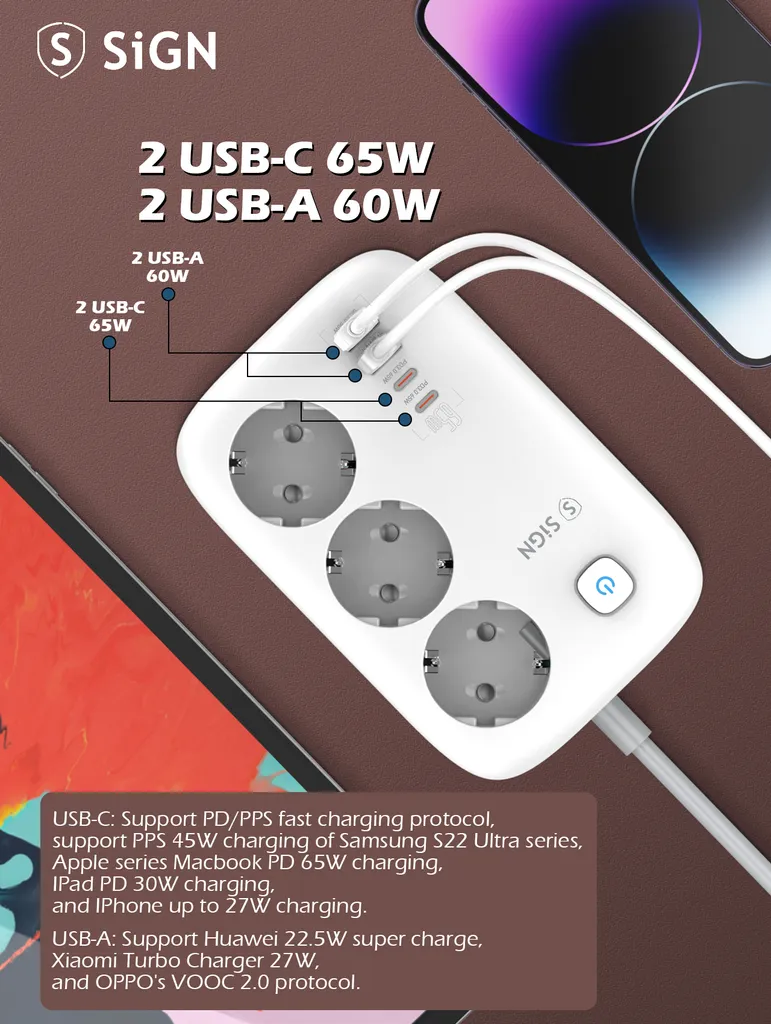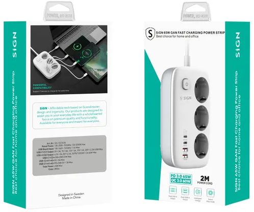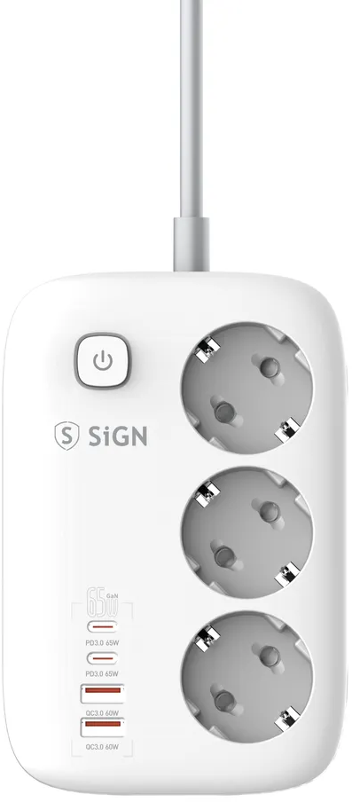 The SiGN 65W GaN Fast Charging Power Strip combines powerful charging with a compact design. With 3 power outlets, 2 USB-A and 2 USB-C ports, you can quickly charge multiple devices at the same time. GaN technology delivers efficient performance with less heat, perfect for work stations, bedside tables or travel. With a total output of 65W, this power strip is ideal for charging everything from laptops to smartphones – reliably, quickly and space-savingly.