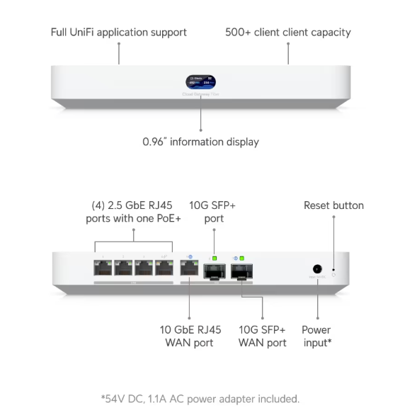 Ubiquiti Networks UniFi Cloud Gateway Fiber, 1x10GbE + 1x10GbE SFP+ WAN, 4x2.5GbE LAN (1 PoE+), 1x10GbE SFP+