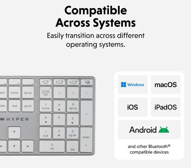 All the functionality you need in a sleek, portable design. The HyperSpace™ Full-Sized Bluetooth® Keyboard is your ultimate productivity tool, featuring seamless multi-device connectivity with Bluetooth 5.0, and 85% post-consumer recycled materials. With universal compatibility for all major operating systems, a comfortable typing angle for all-day comfort, and adjustable backlit keys for clarity in any light, this keyboard adapts to your workflow with ease