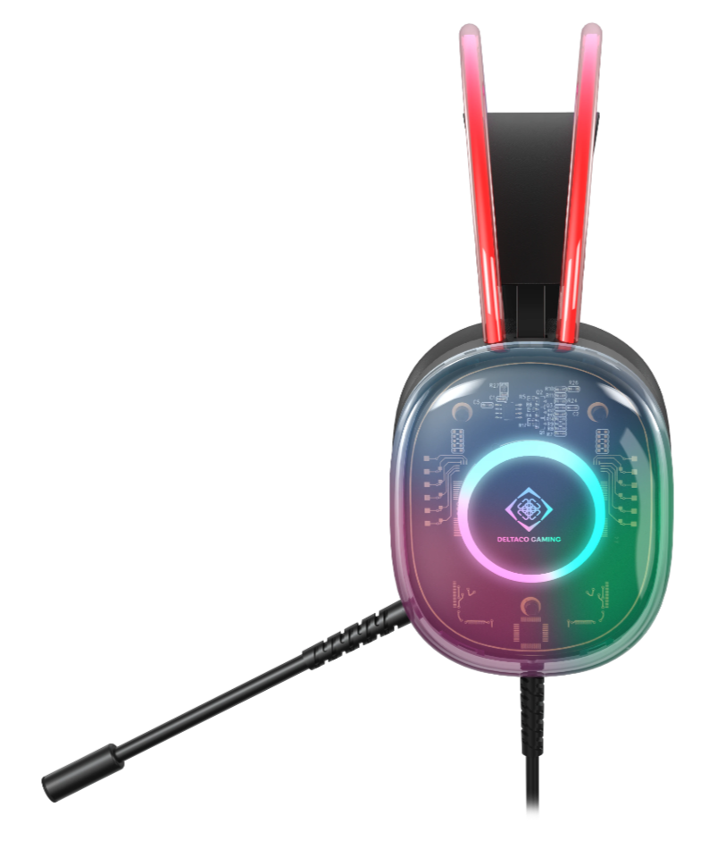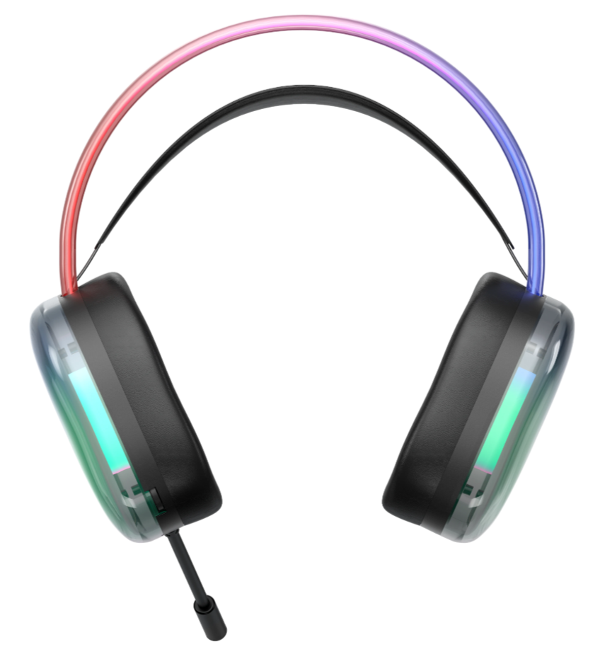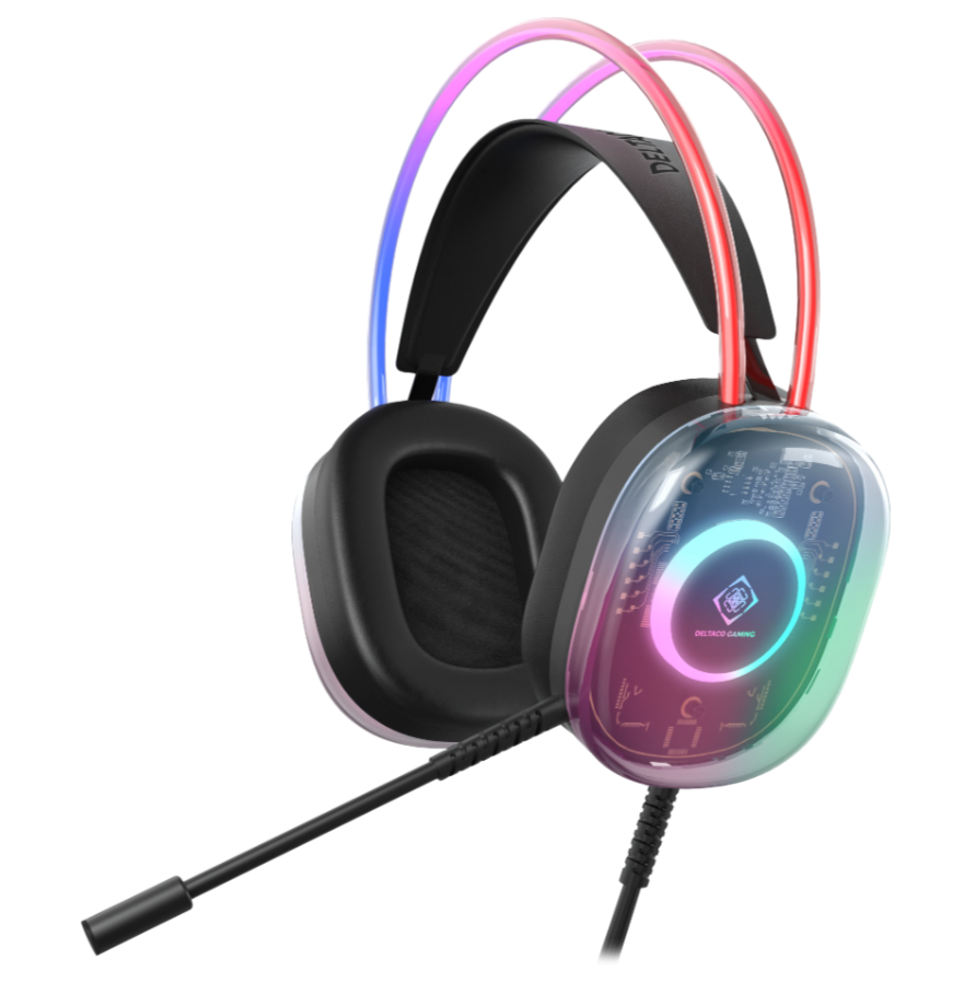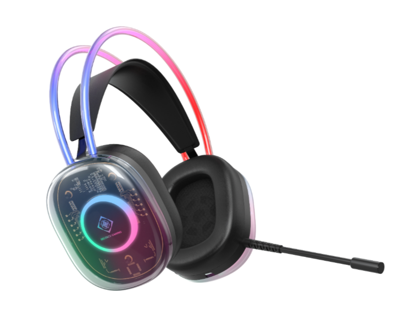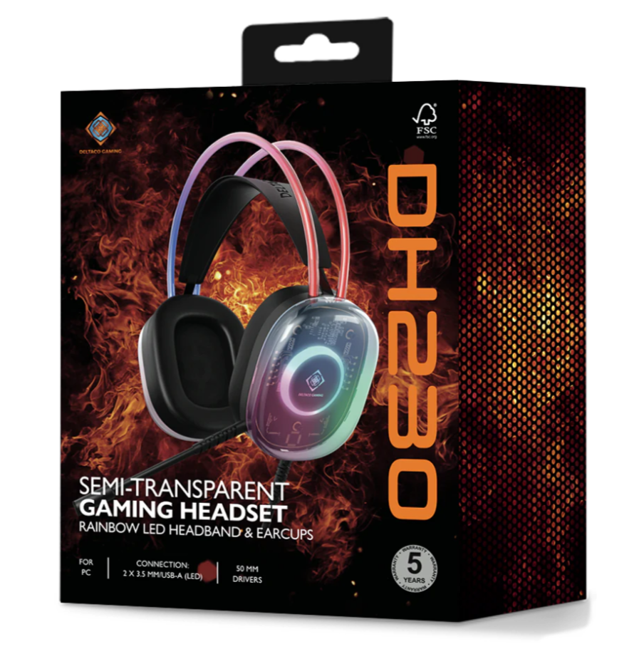 DH230 har en unik design med sina transparenta öronkåpor och vibrerande ljuseffekter med ett regnbågsfärgat LED-ljus i både huvudbandet och öronkåporna. Volymjusteringen finns på öronkåpan. Det självjusterande huvudbandet och den flexibla mikrofonen ger optimal komfort. De 50mm elementen levererar klart ljud, och hörlurarna är kompatibelt med PC med två 3,5mm-anslutningar samt USB för LED-ljusen. Med en vikt på bara 285 g, inklusive kabel, är det både lätt och hållbart.