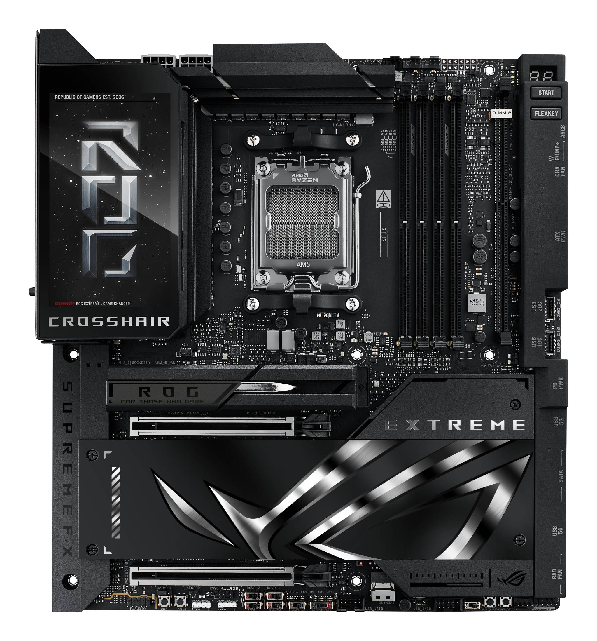 Asus ROG Crosshair X870E EXTREME, AMD Socket AM5, ATX, 4xDDR5, 4xPCI Express, SlimSAS + 5xM.2 + SATA3 RAID, HDMI/2xUSB4, ROG SupremeFX 7.1 audio, 10GbE+5GbE LAN, WiFi 7, Bluetooth 5.4, Aura Sync RGB