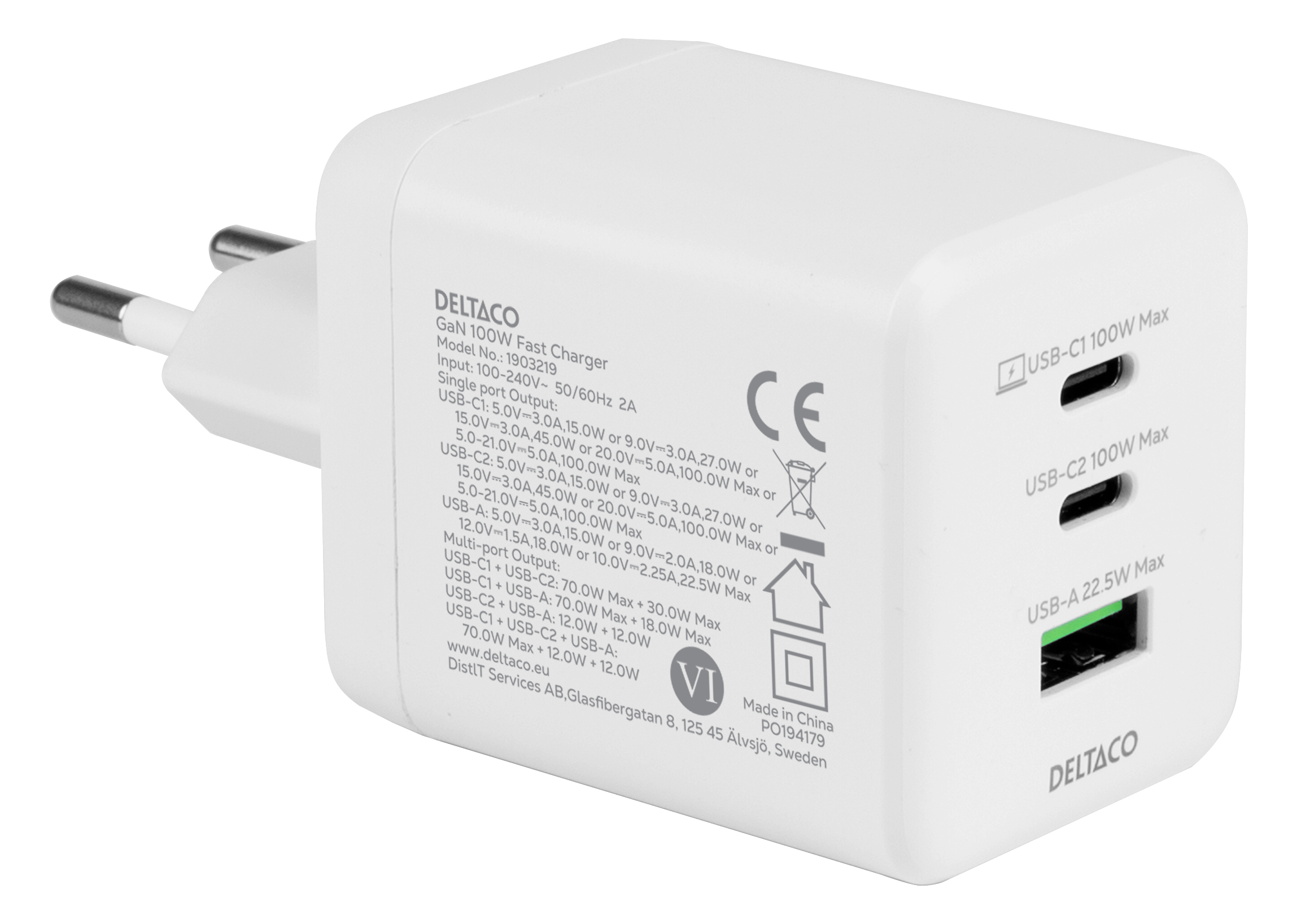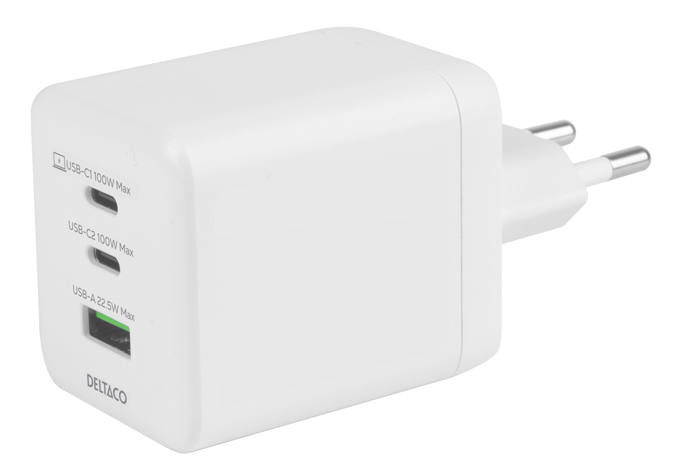 AC-adapter Deltaco USB GaN Wall Charger 100W, 2xUSB-C / 1xUSB-A