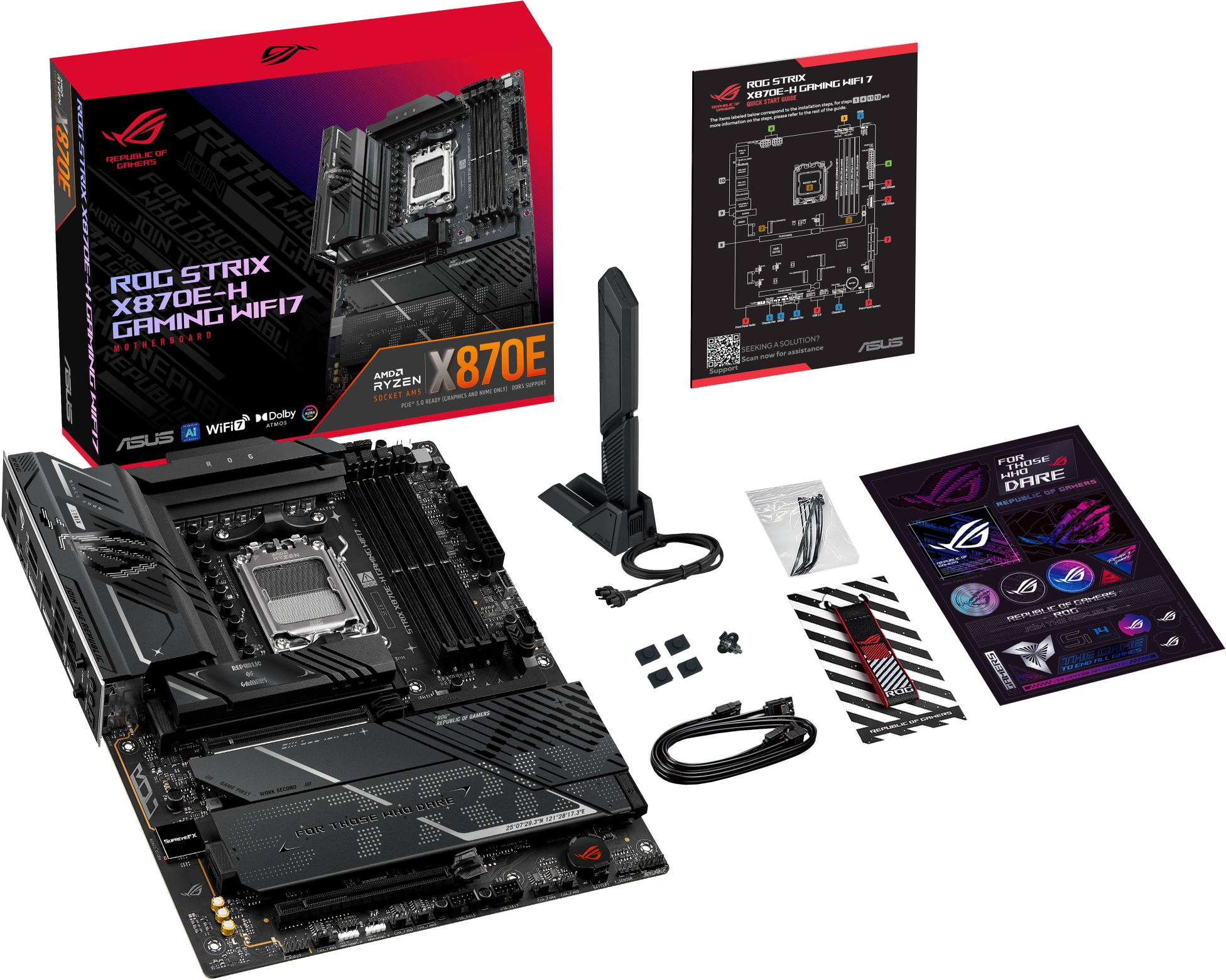 Transform your gaming experience with the ROG STRIX X870E-H GAMING WIFI7 motherboard. Engineered to dominate with AMD Ryzen™ 9000 Series Desktop Processors, this ATX powerhouse features cutting-edge power design and AI-enhanced solutions. With PCIe 5.0 x16 slots, dual USB4® Type-C ports, and WiFi 7, it delivers advanced connectivity. DIY-friendly features like M.2 Q-Release on all four M.2 slots and PCIe Slot Q-Release make building and upgrades effortless. Unleash your system's full potential with the ROG STRIX X870E-H GAMING WIFI7.