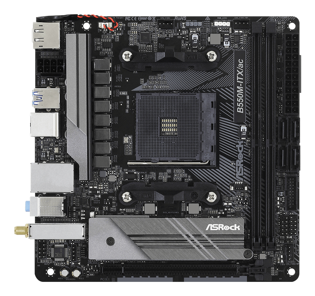 ASRock B550M-ITX/ac, AMD Socket AM4, Mini-ITX, 2xDDR4, PCI Express, 2xM.2 + SATA3 RAID, HDMI/DP, USB-C, GigaLAN, WiFi 5, Bluetooth 4.2