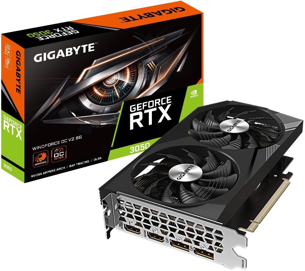 Nvidia RTX 3050 8GB GDDR6 2DP/2HDMI 7680*4320 1792MHz 2560CUDA 130/450W 4mon PCIe4 213mm 2-slot refurbished Gigabyte