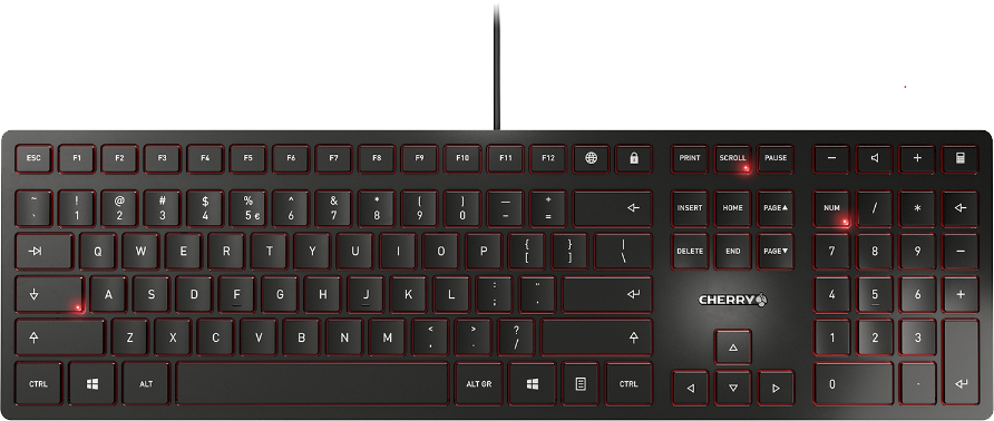 The CHERRY KC 6000 SLIM keyboard impresses with its precise scissor mechanism, compact dimensions and state-of-the-art design. A sturdy keyboard with an integrated metal plate, it is a particularly attractive addition to the desk of the style-conscious user. Exceptionally compact, slim housing High-quality scissor mechanism for perfect keystroke Durable key lettering Status LEDs for the CAPS LOCK, NUM and SCROLL keys 6 practical additional keys Sturdy construction with integrated metal plate Keyboard Key technology: SX Service life, standard key: > 10 million key operations Number of Keys: Product dependant, see table "Models" Packaging dimensions: approx. 453 x 170 x 33 mm Dimensions (product): approx. 440 x 130 x 15 mm Delivery volume CHERRY KC 6000 Slim Operating instructions in hard copy System requirements: For connection using USB: Free USB port (type A), Windows 7, 8, 10 or 11 Connection sockets: USB Operating