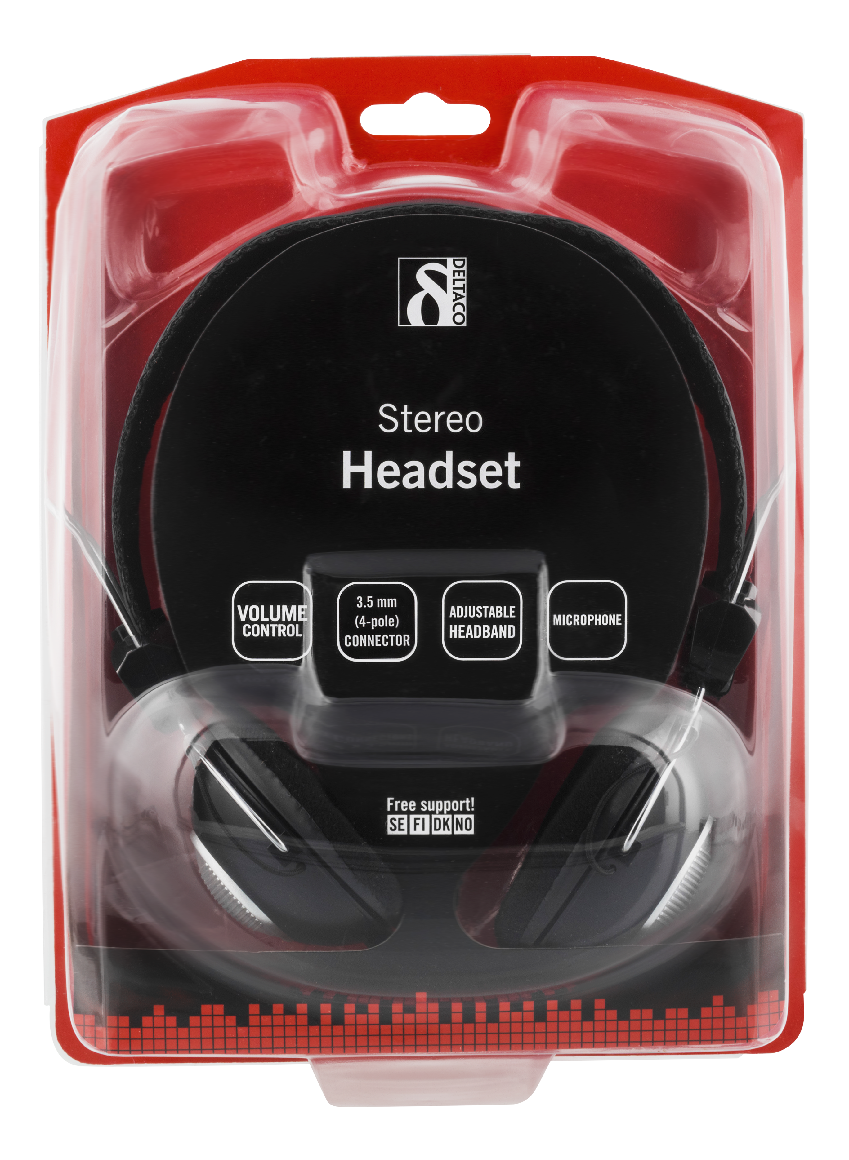 DELTACO Stereo Headset, on-ear, 1x 3,5mm 4-polig, 40mm element, 2m tygklädd kabel, svart